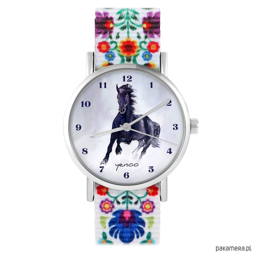Zegarek - Czarny koń, cyfry - folk biały, nylon
