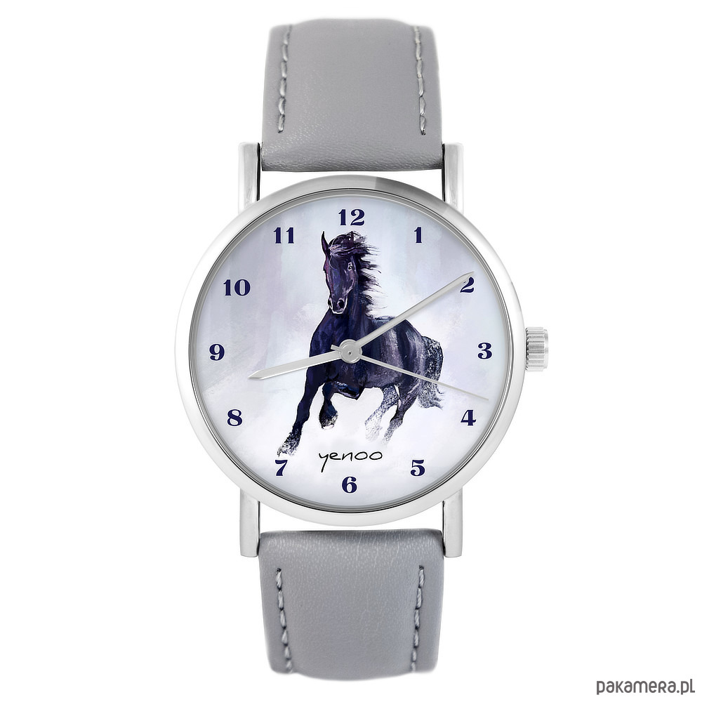 Zegarek - Czarny koń, cyfry - skóra, szary