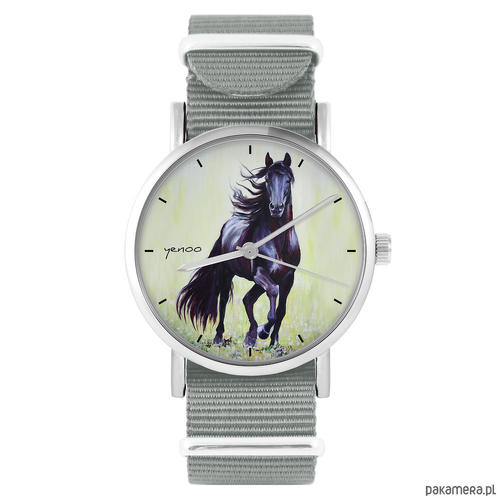Zegarek - Czarny koń malowany - szary, nylonowy