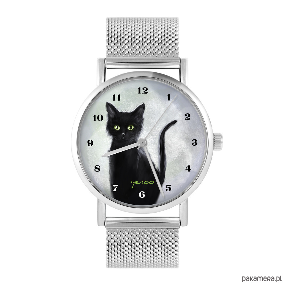 Zegarek - Czarny kot, cyfry - bransoleta mesh