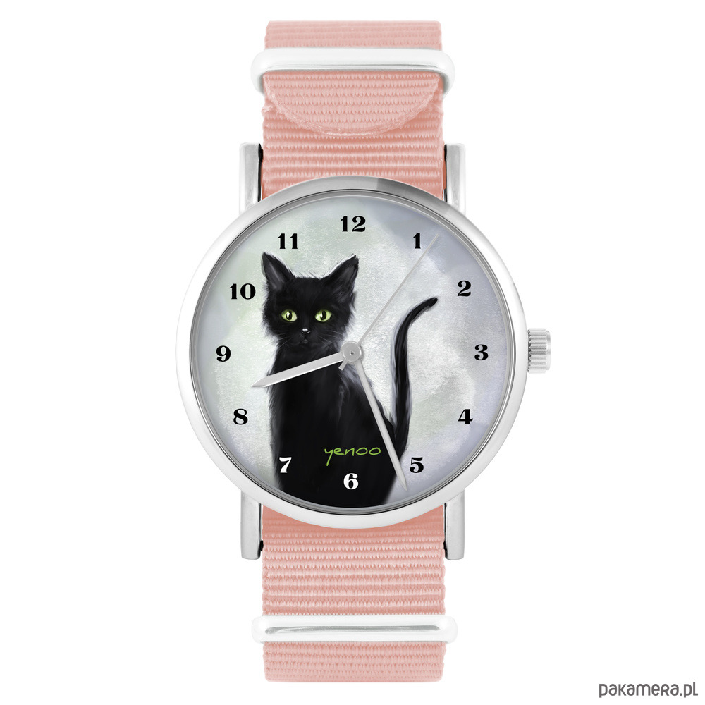 Zegarek - Czarny kot, cyfry - brzoskwiniowy róż