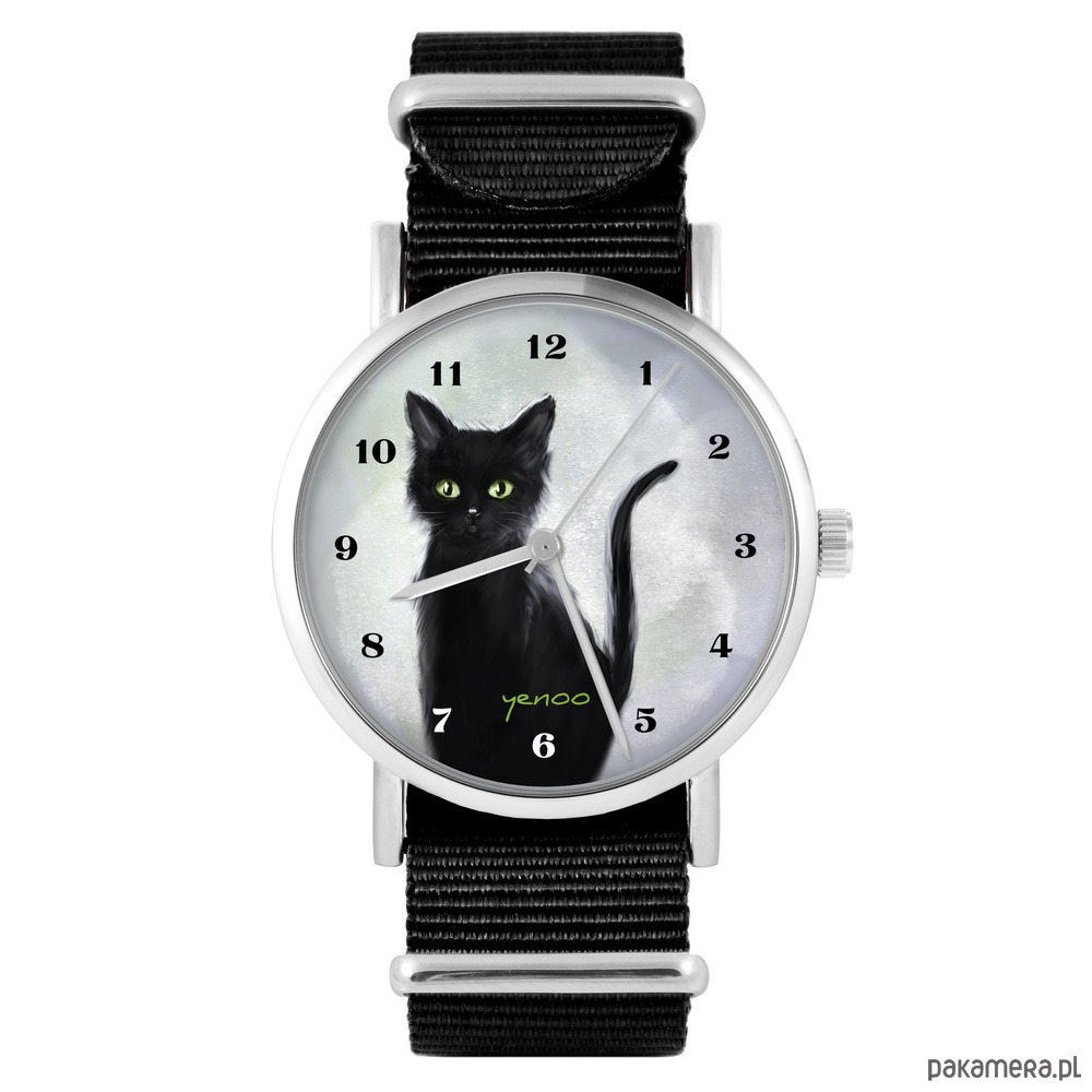 Zegarek - Czarny kot , cyfry - czarny, nylonowy