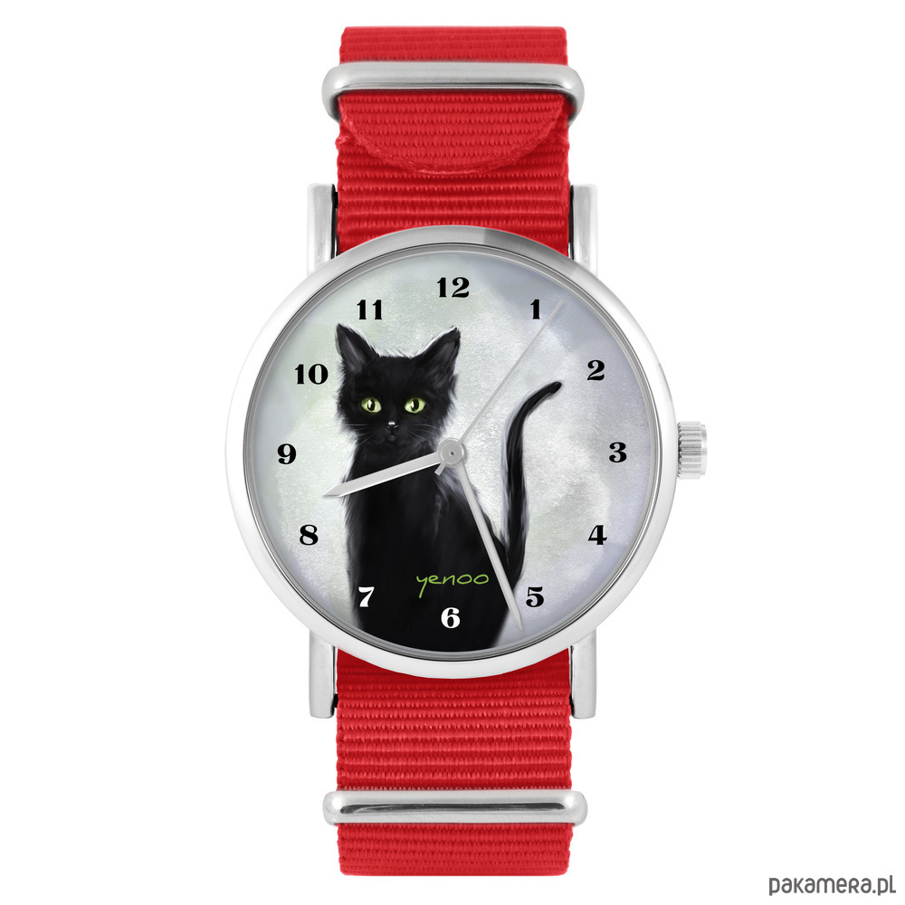 Zegarek - Czarny kot, cyfry - czerwony, nylonowy
