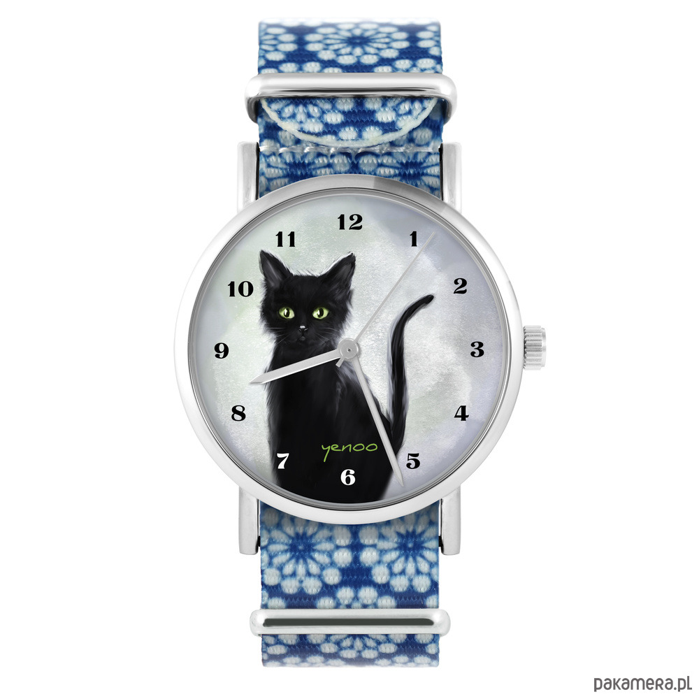 Zegarek - Czarny kot , cyfry - niebieski, kwiaty