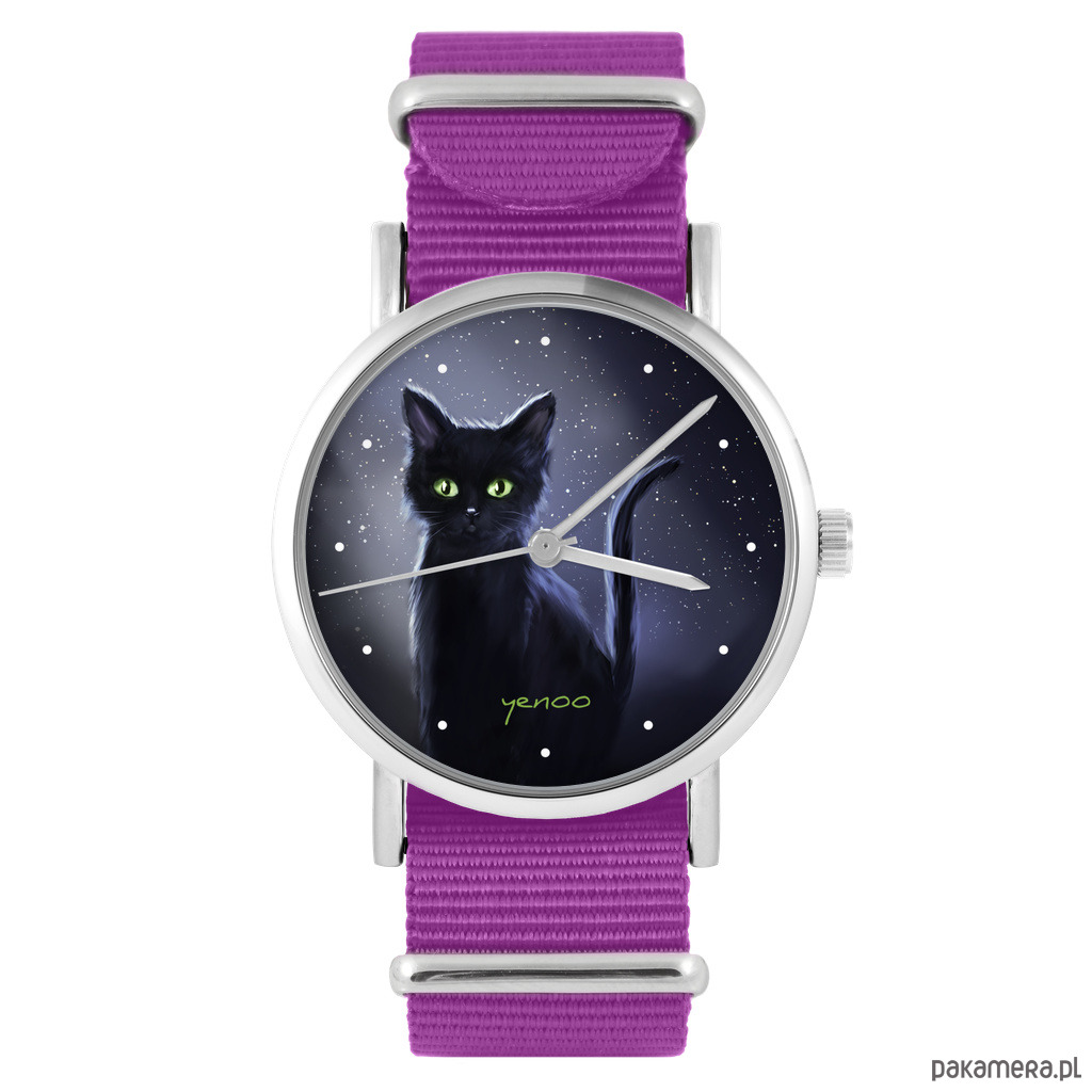 Zegarek - Czarny kot, noc - amarant, nylonowy