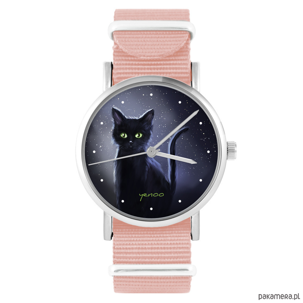 Zegarek - Czarny kot, noc - brzoskwiniowy róż