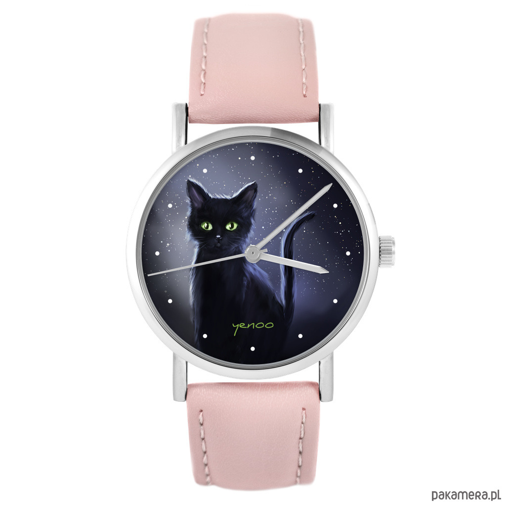 Zegarek - Czarny kot, noc - pudrowy róż, skóra