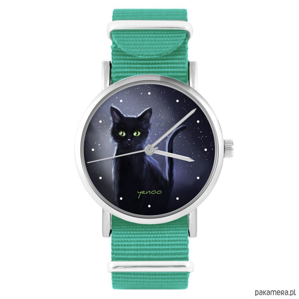 Zegarek - Czarny kot , noc - turkusowy, nylonowy