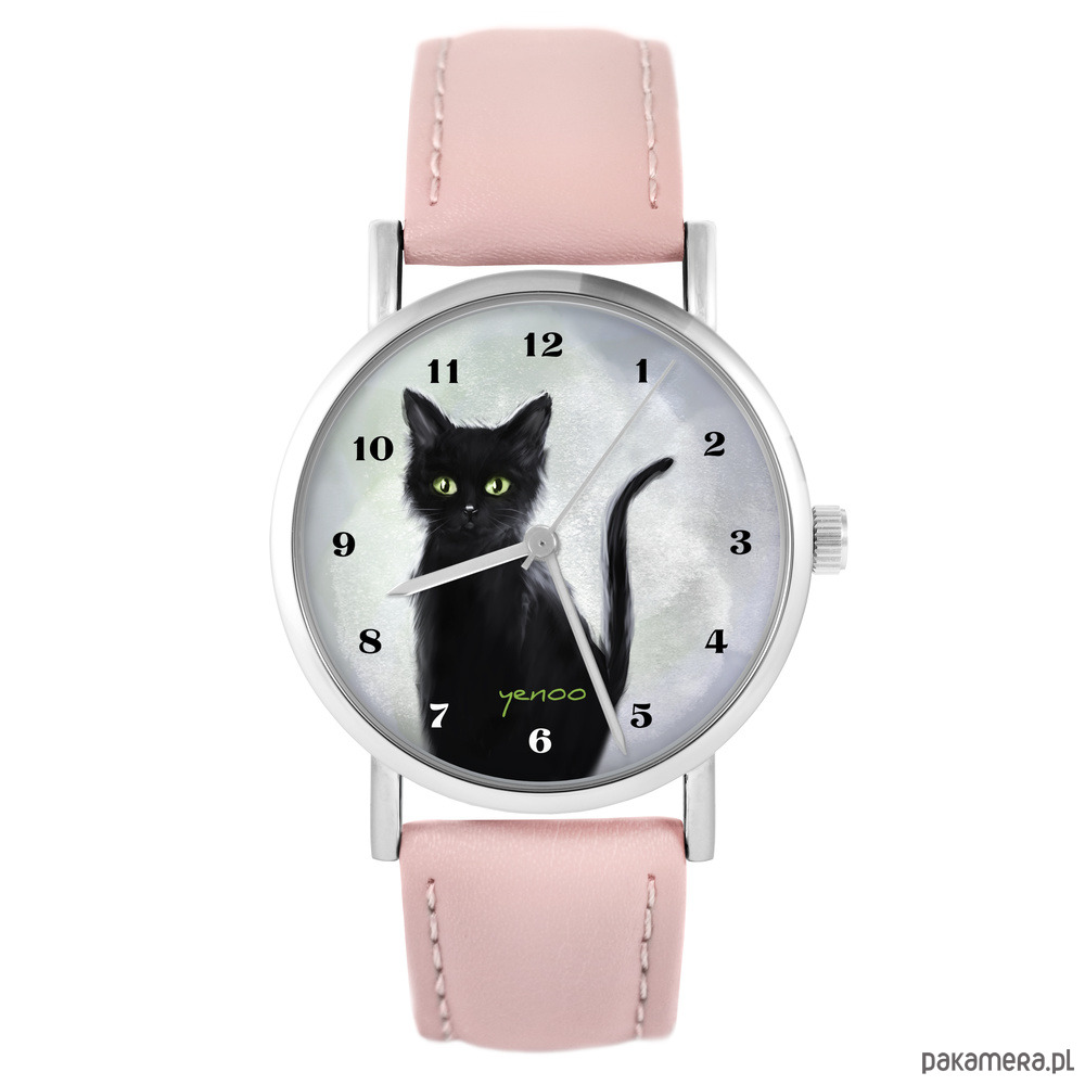 Zegarek - Czarny kot - pudrowy róż, skóra