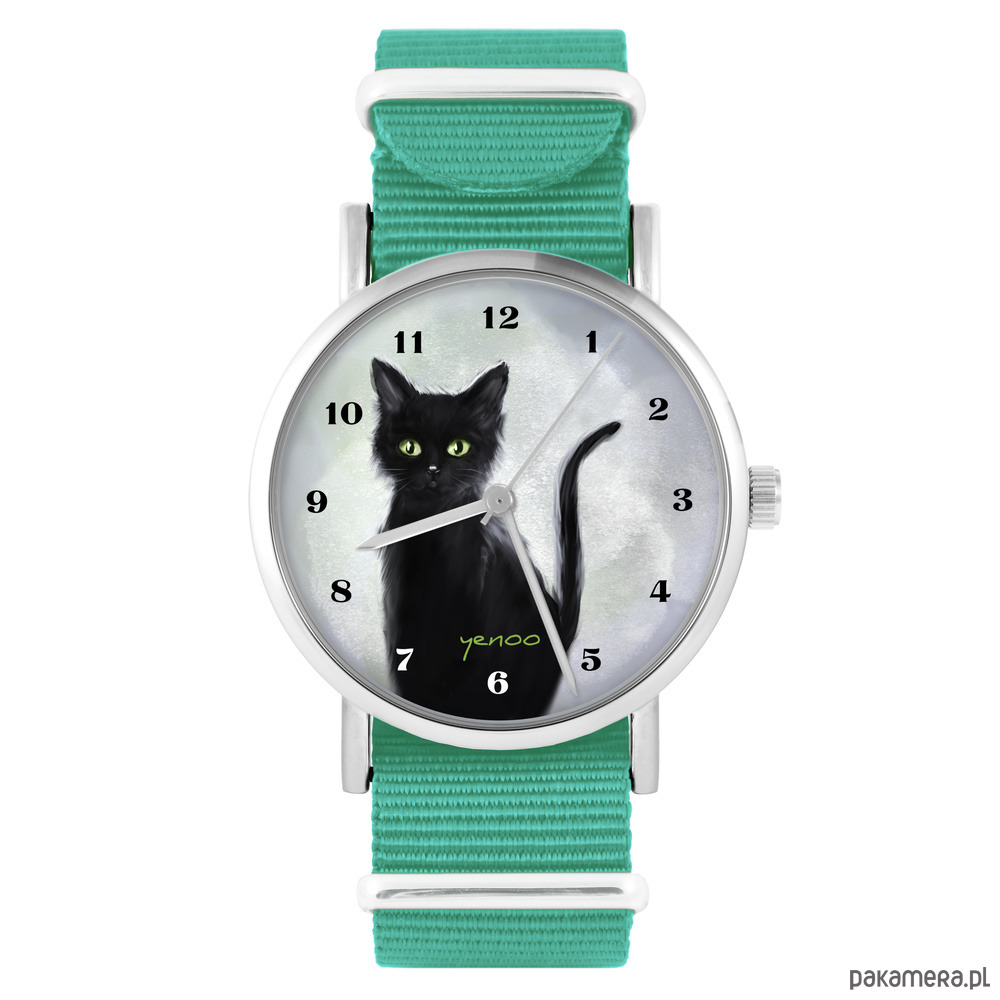 Zegarek - Czarny kot - turkusowy, nylonowy