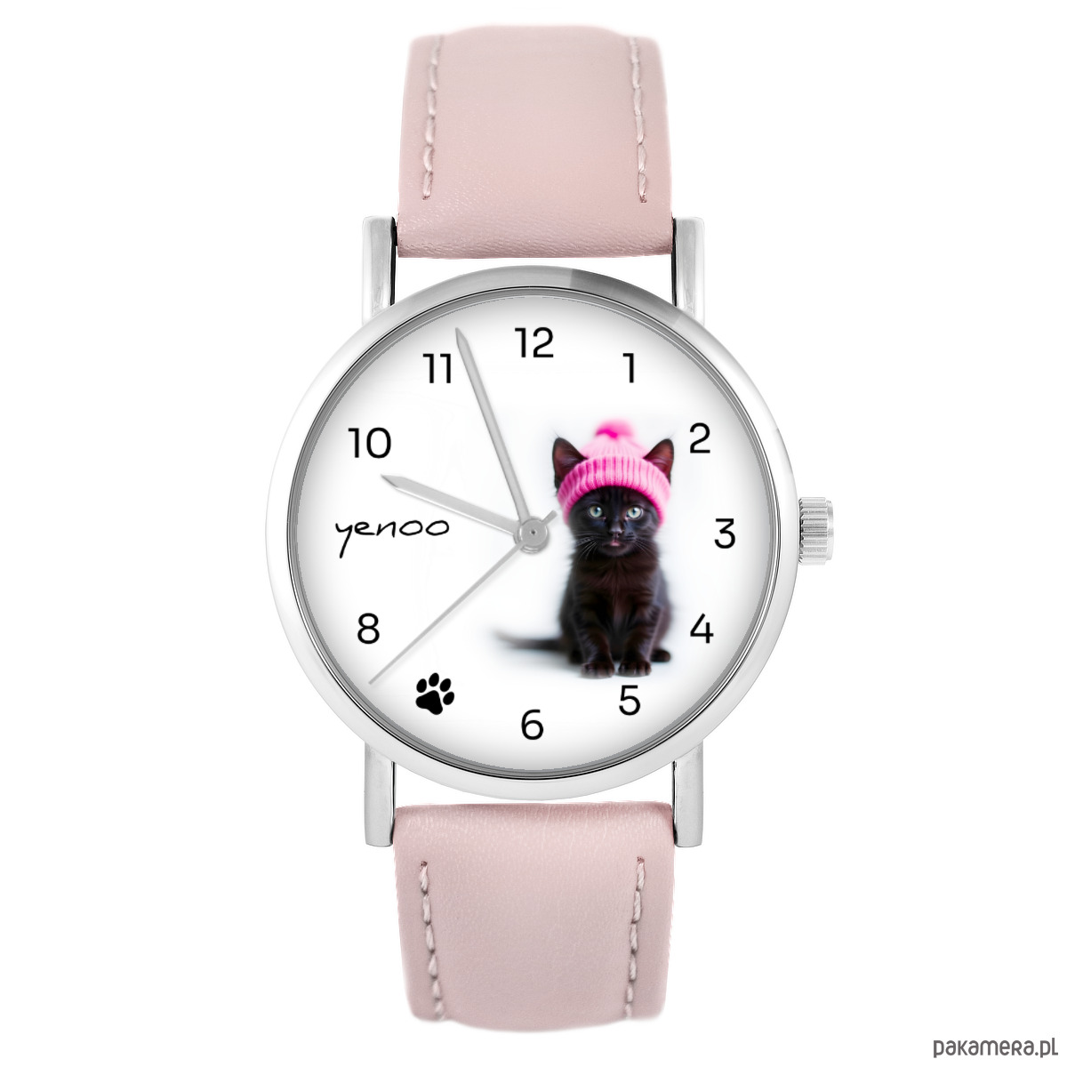 Zegarek - Czarny kotek - pudrowy róż, skóra