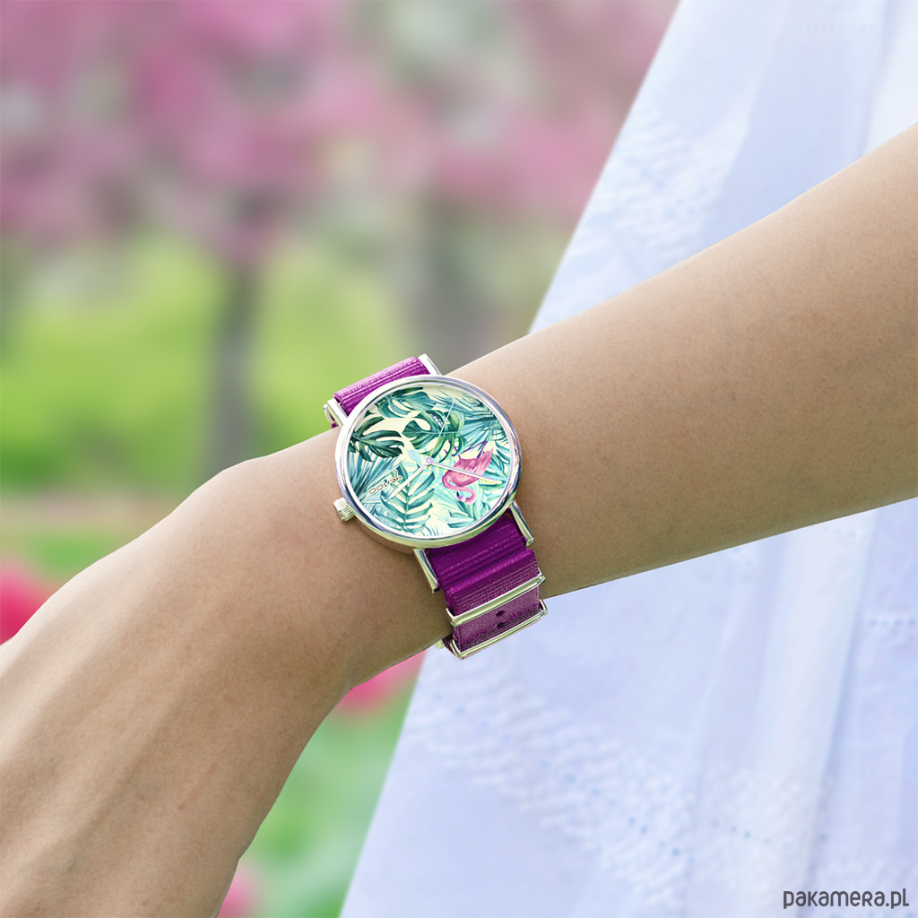 Zegarek - Flaming, tropikalny - amarant, palmy