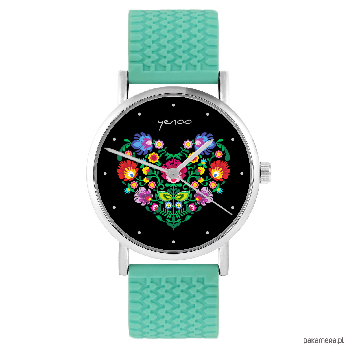 Zegarek - Folkowe serce, czarne - silikonowy, turkus