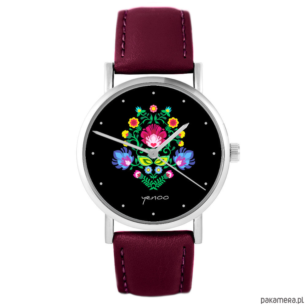 Zegarek - Folkowy czarny - skórzany, burgund