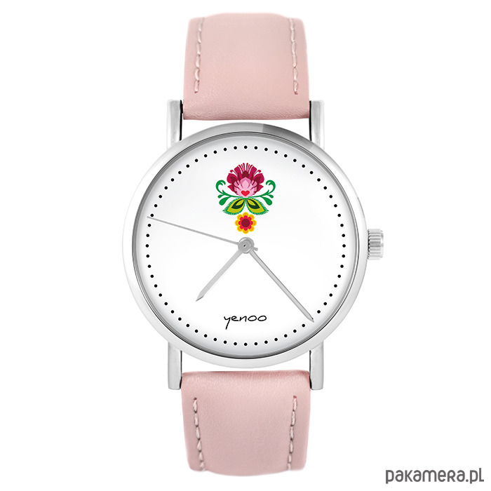 Zegarek - Folkowy kwiat - skóra, pudrowy róż