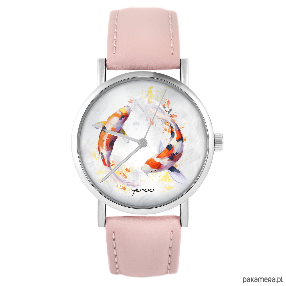 Zegarek - Karpie Koi - pudrowy róż, skóra