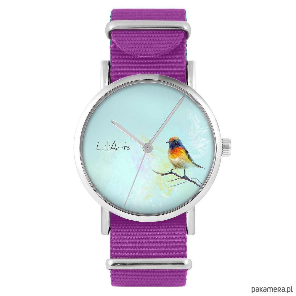 Zegarek - Kolorowy ptak - amarant, nylonowy