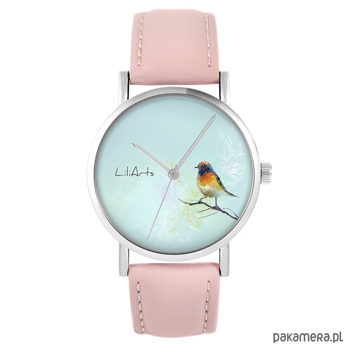Zegarek - Kolorowy ptak - skóra, pudrowy róż