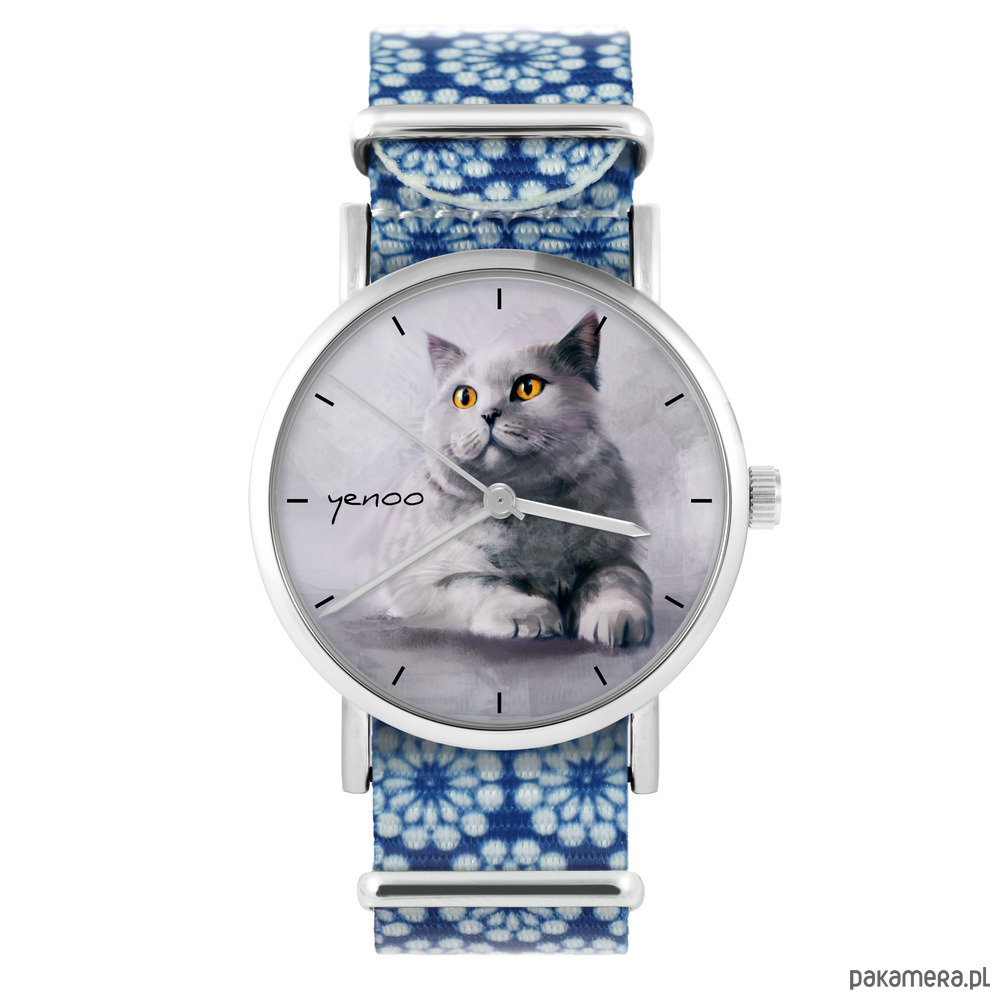 Zegarek - Kot brytyjski - niebieski, kwiaty