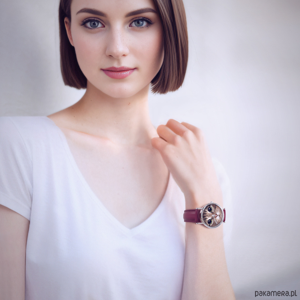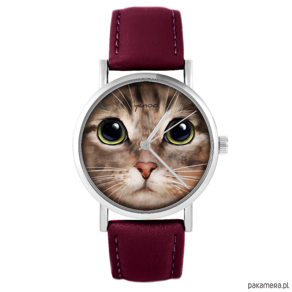 Zegarek - Kot tygrysek - skórzany, burgund