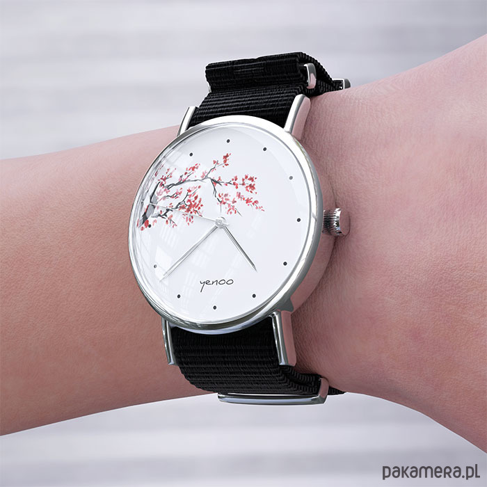 Zegarek - Kwitnąca wiśnia - czarny, nylonowy