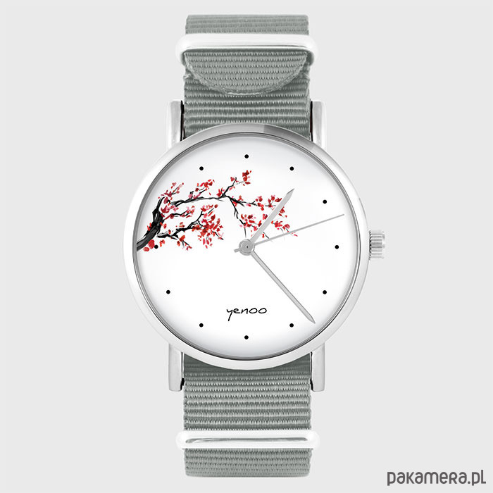 Zegarek - Kwitnąca wiśnia - szary, nylonowy
