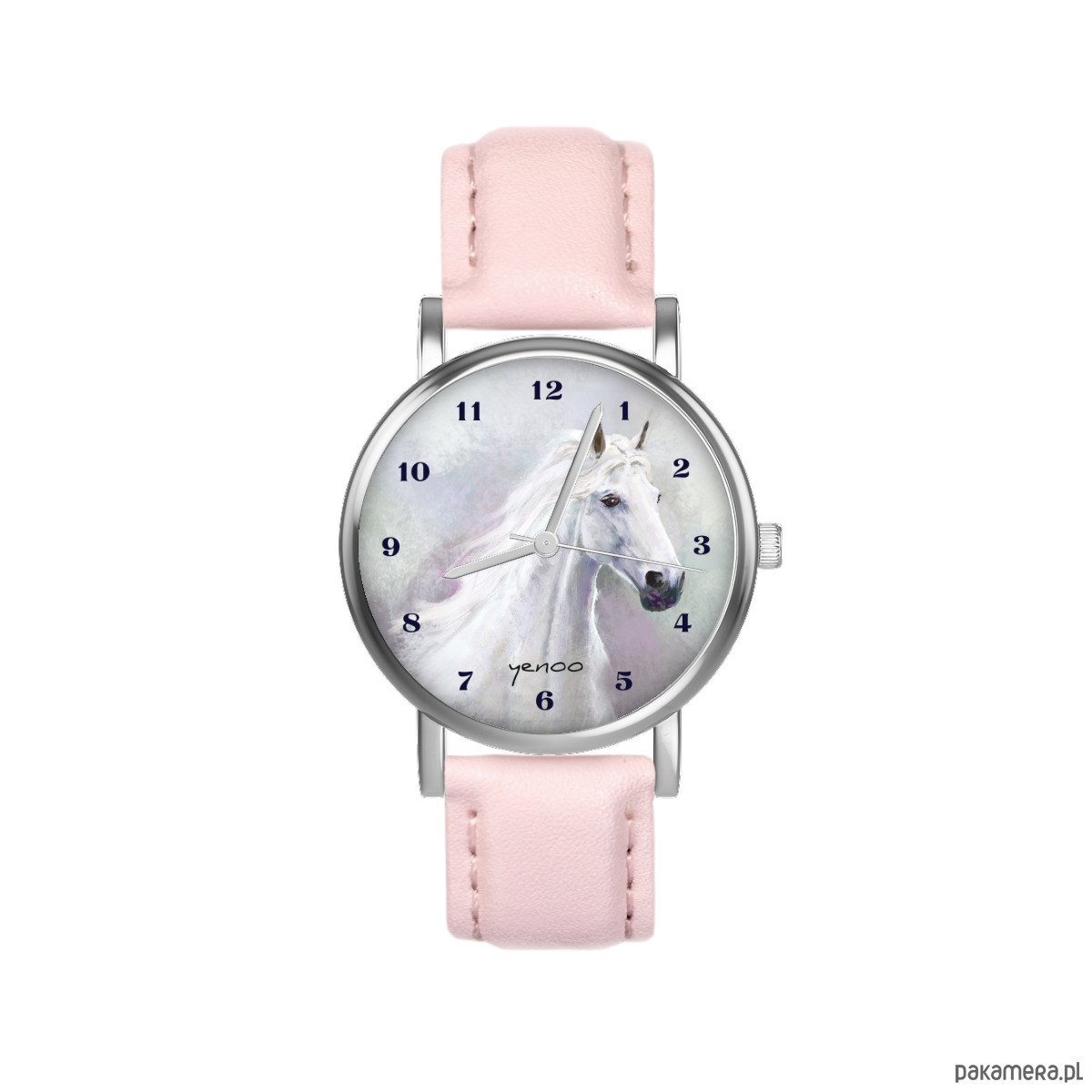 Zegarek mały - Biały koń - skórzany, pudrowy róż