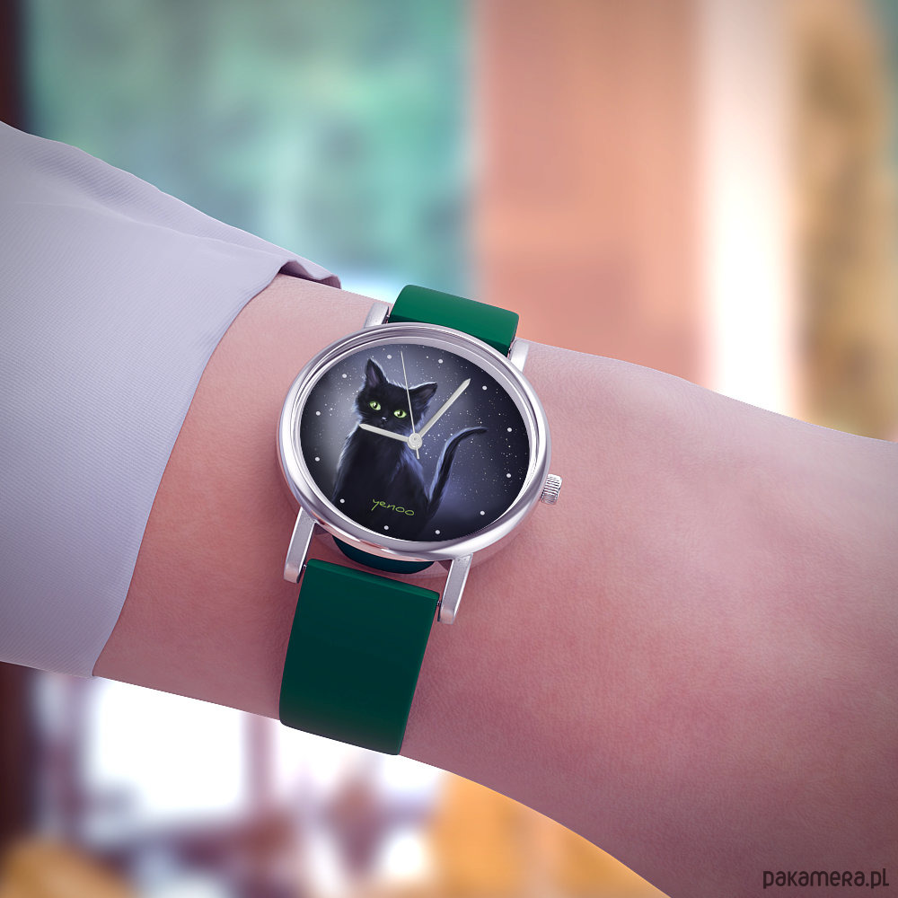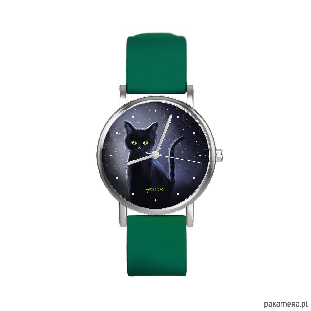 Zegarek mały - Czarny kot, noc - silikonowy, zielony