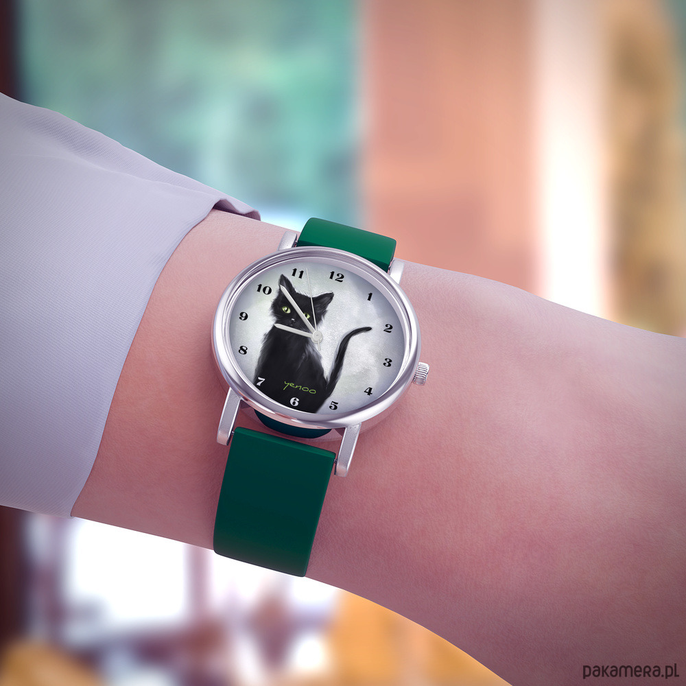 Zegarek mały - Czarny kot - silikonowy, zielony