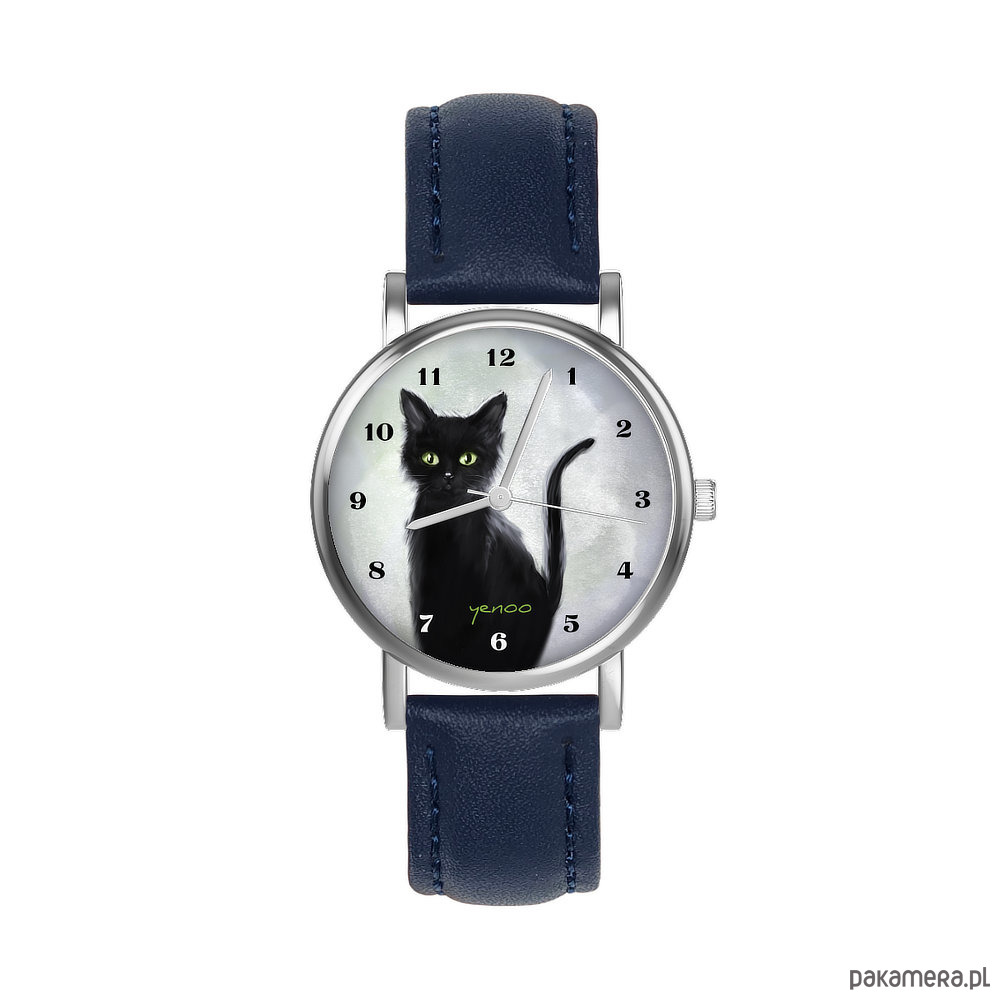 Zegarek mały - Czarny kot - skórzany, granatowy