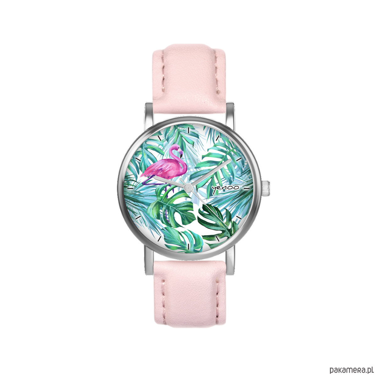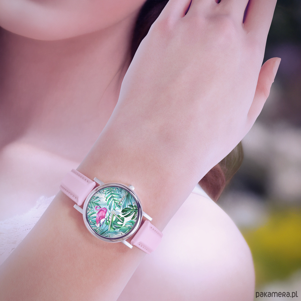 Zegarek mały - Flaming, tropikalny - skórzany, pudrowy róż