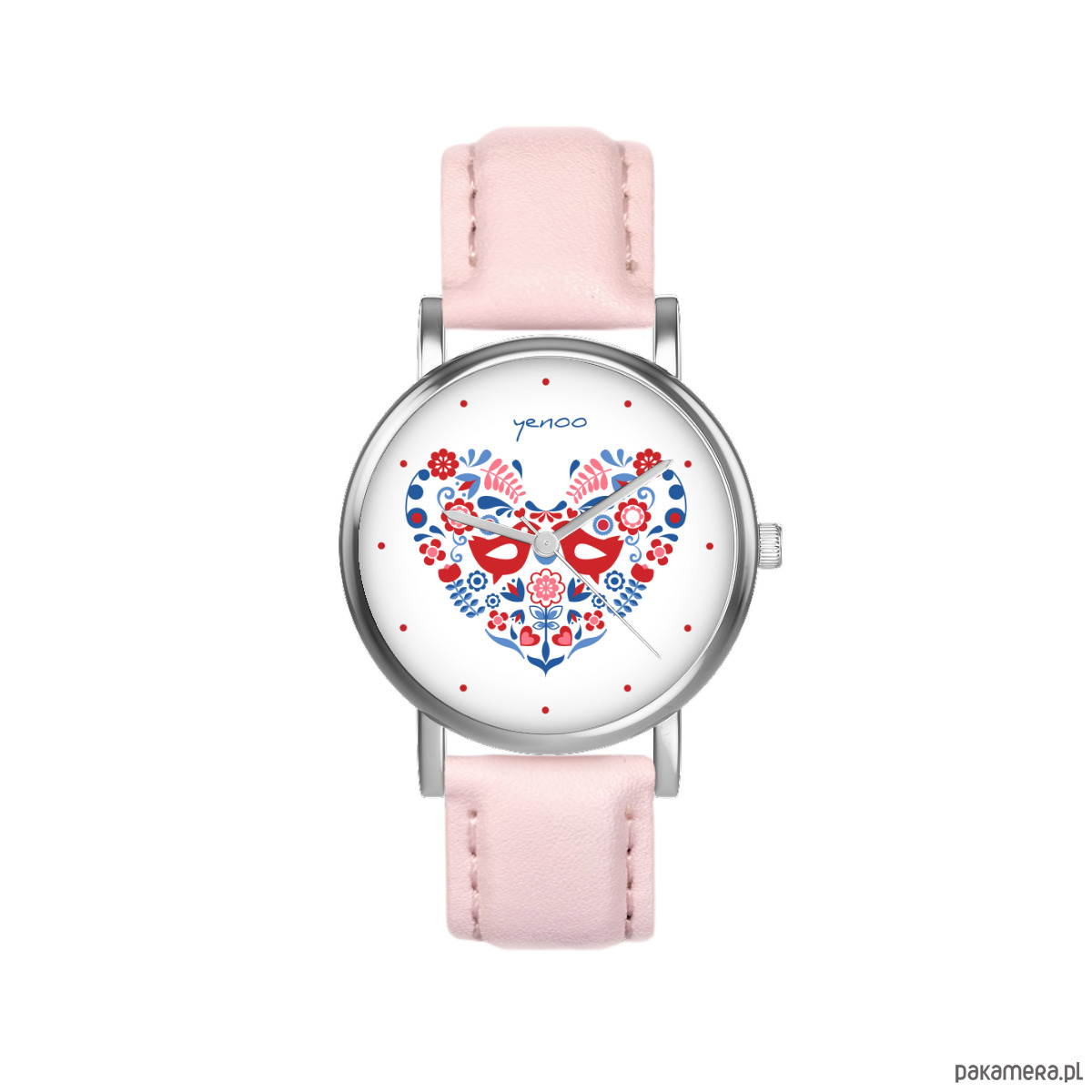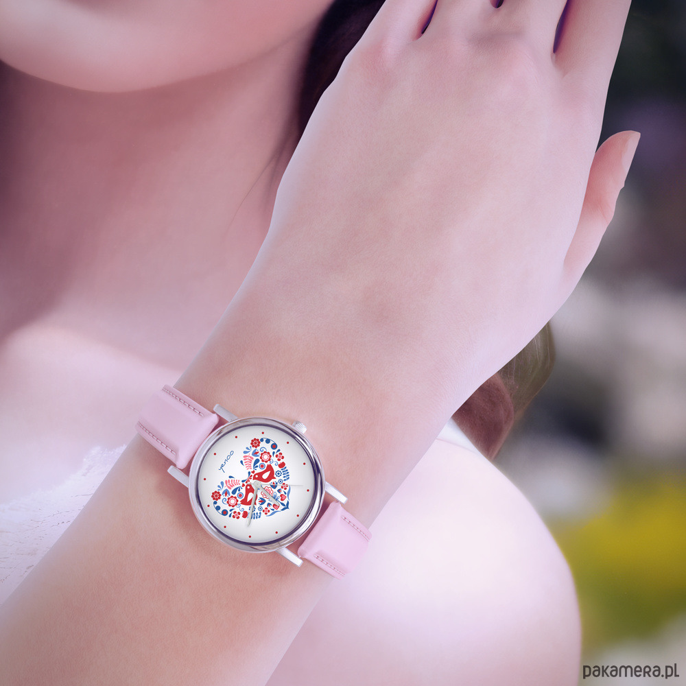 Zegarek mały - Folkowe ptaszki - skórzany, pudrowy róż
