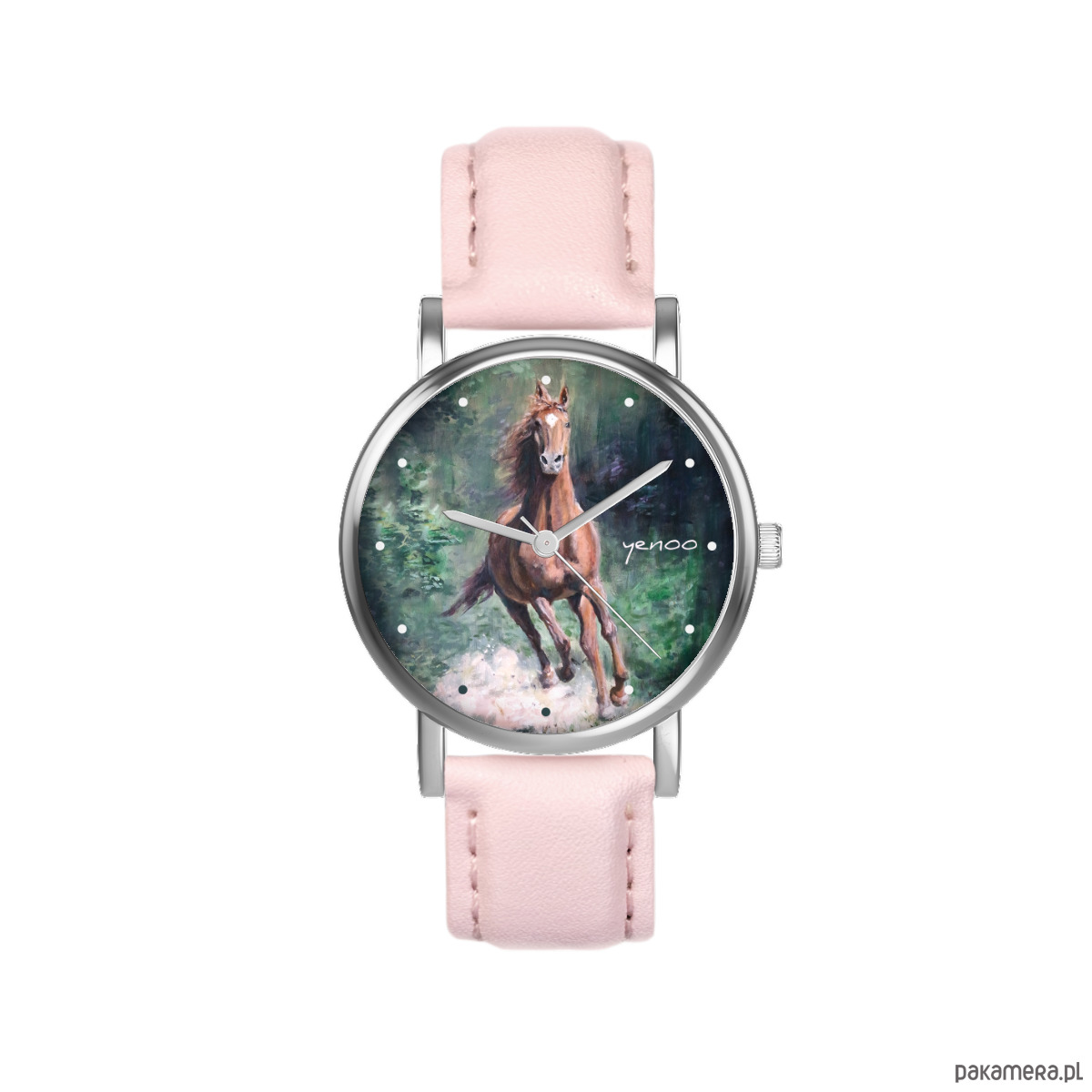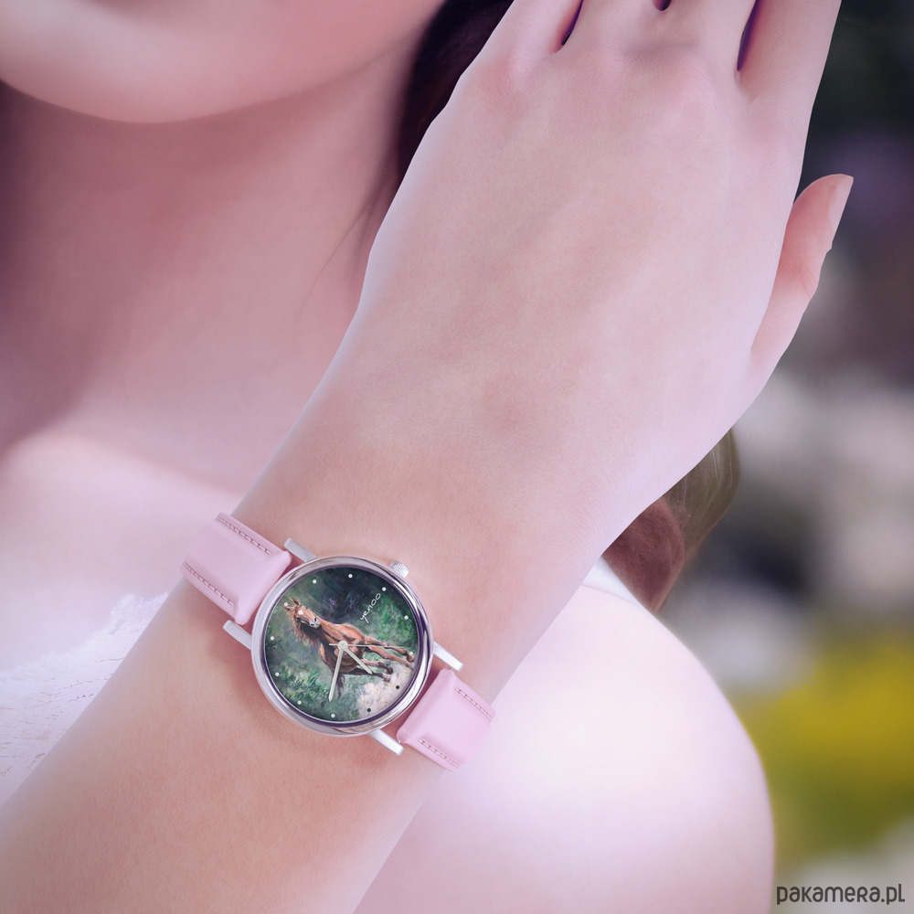 Zegarek mały - Koń, las - skórzany, pudrowy róż