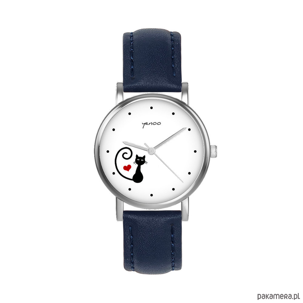 Zegarek mały - Kotek, serce - skórzany, granatowy