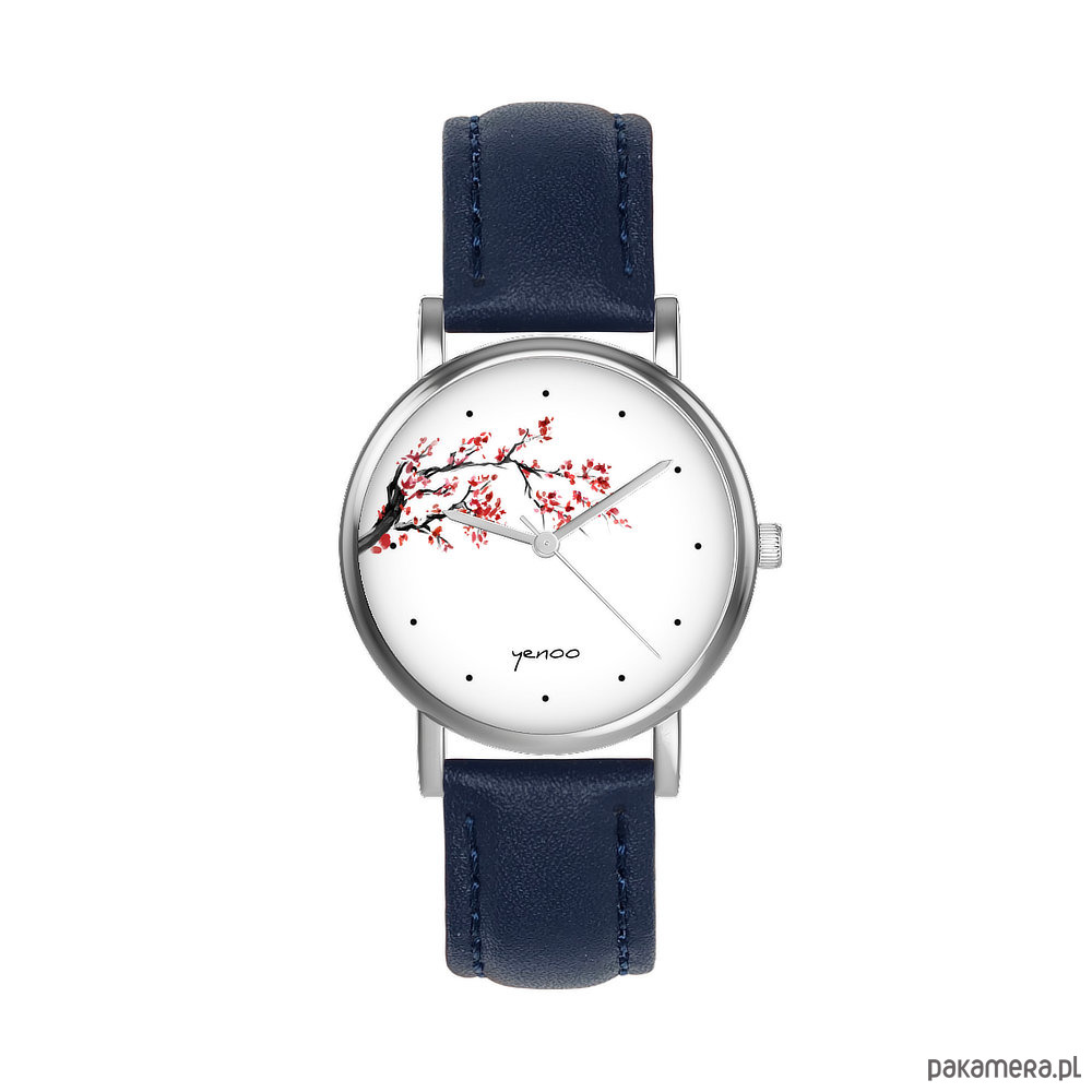 Zegarek mały - Kwitnąca wiśnia - skórzany, granatowy