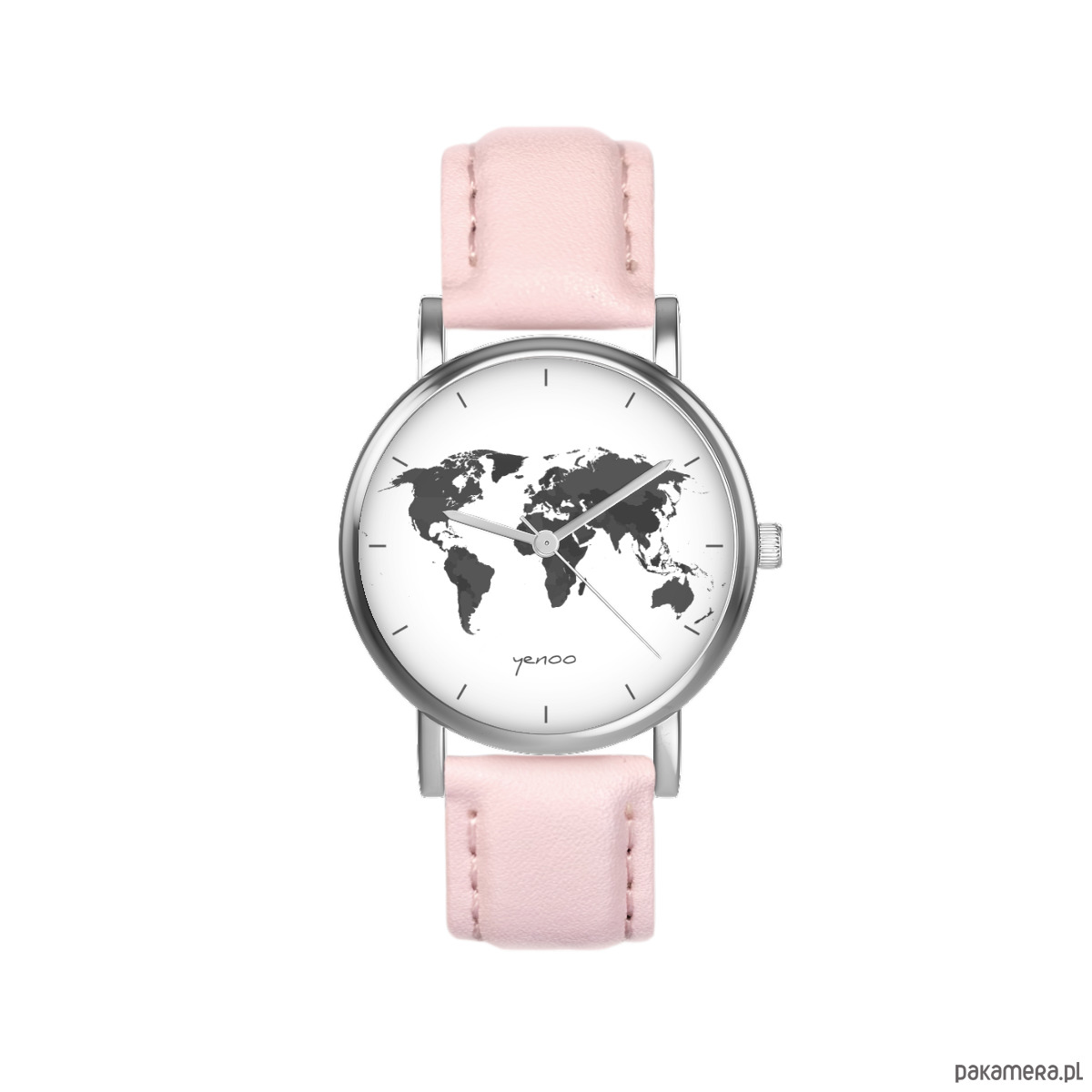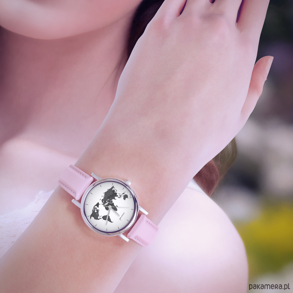 Zegarek mały - Mapa świata - skórzany, pudrowy róż