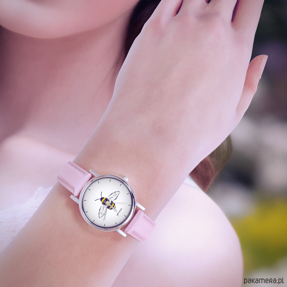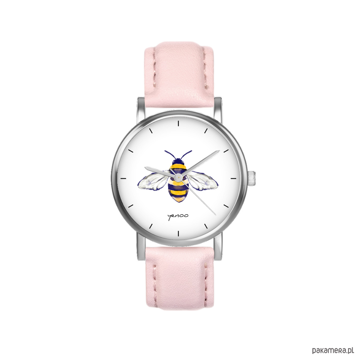 Zegarek mały - Pszczoła - skórzany, pudrowy róż
