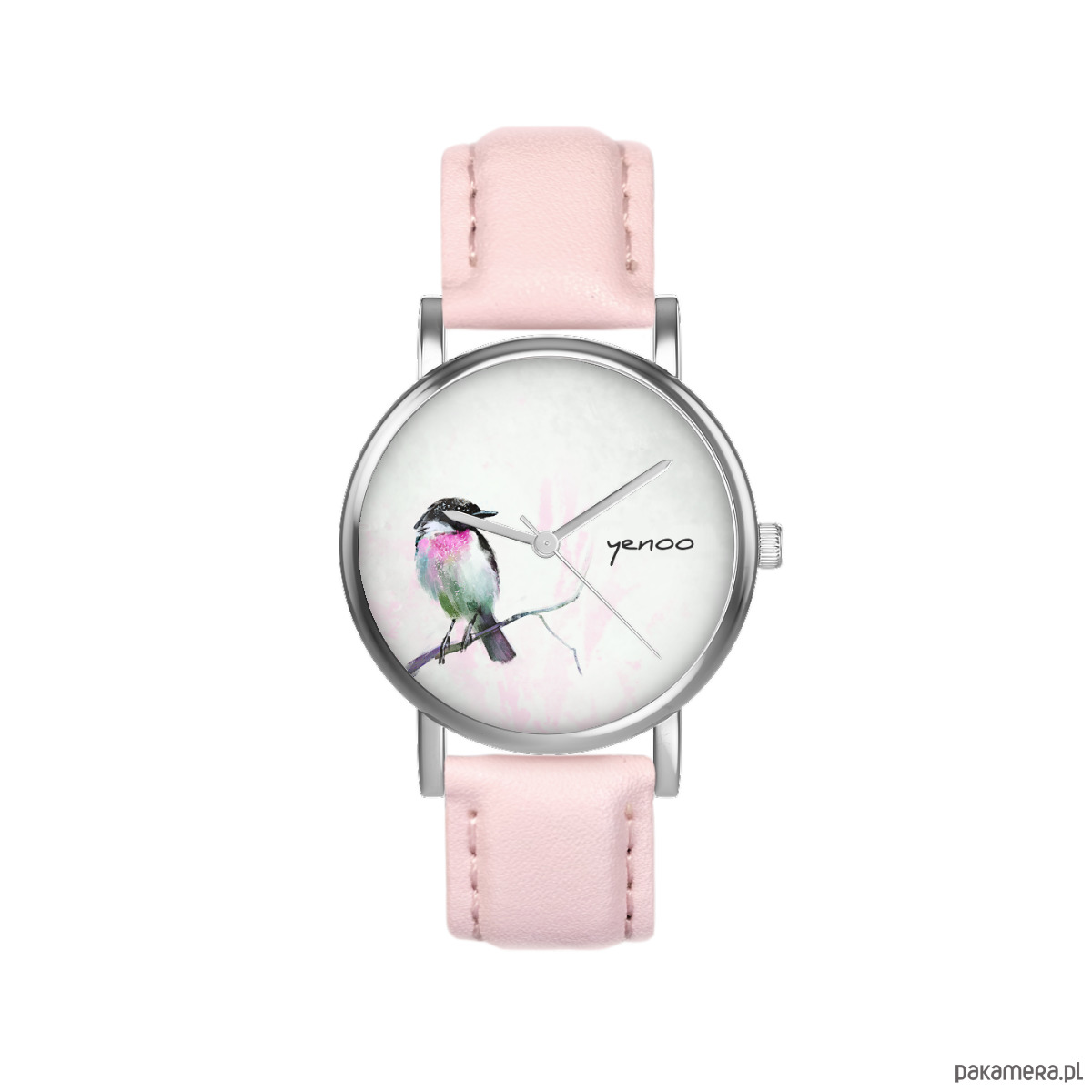 Zegarek mały - Ptaszek - skórzany, pudrowy róż
