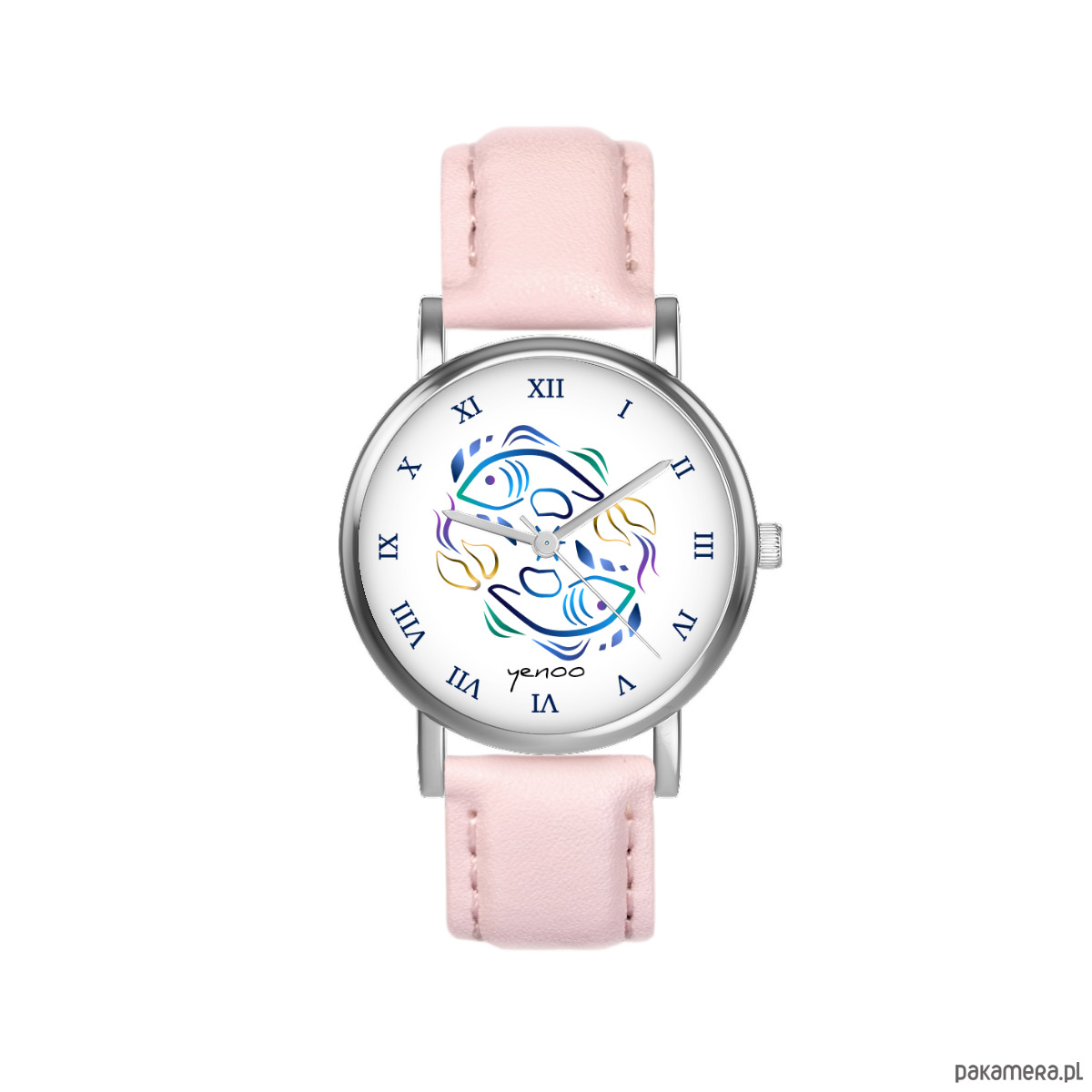 Zegarek mały - Ryby - skórzany, pudrowy róż