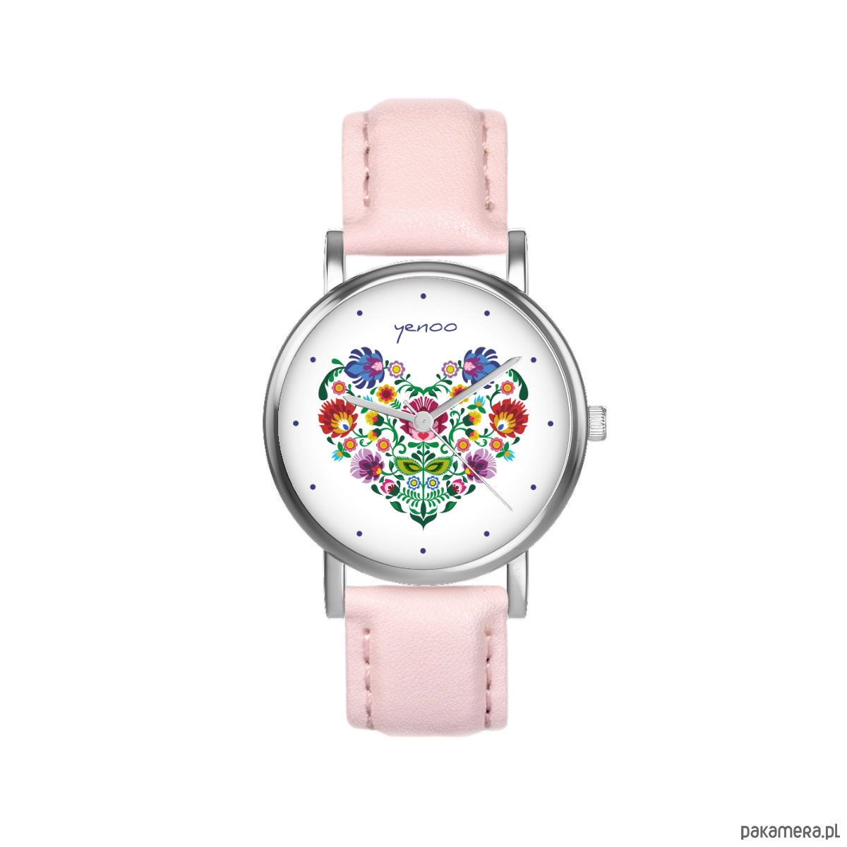 Zegarek mały - Serce folkowe - skórzany, pudrowy róż
