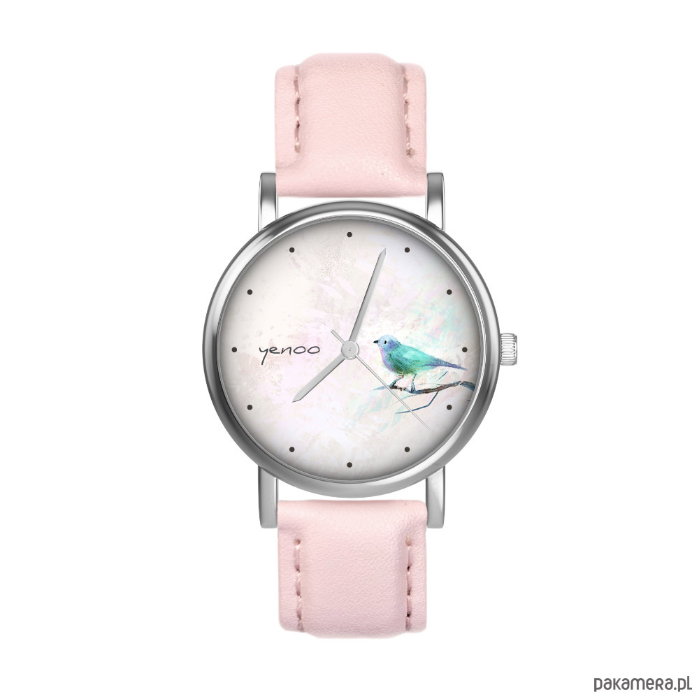 Zegarek mały - Turkusowy ptaszek - skórzany, pudrowy róż