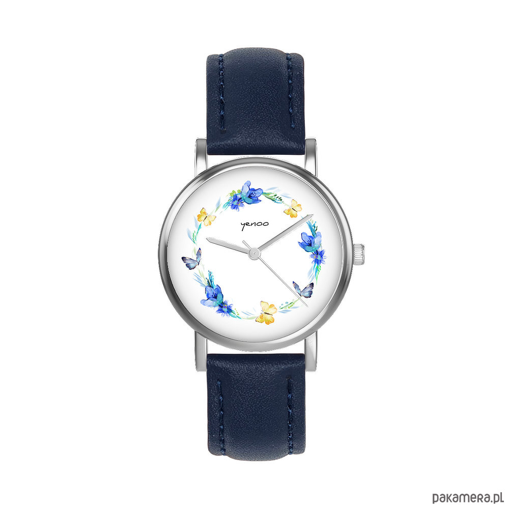 Zegarek mały - Wianek, motyle - skórzany, granatowy