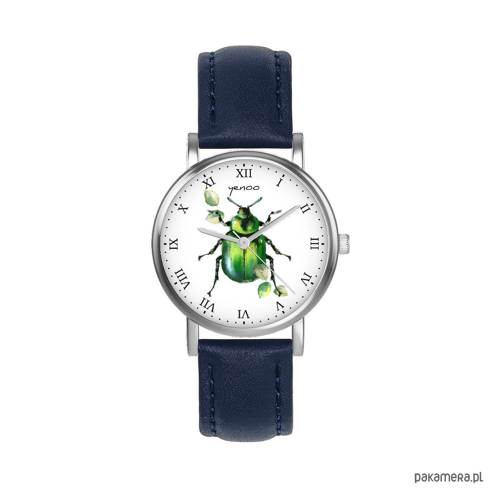 Zegarek mały - Zielony żuczek - skórzany, granatowy