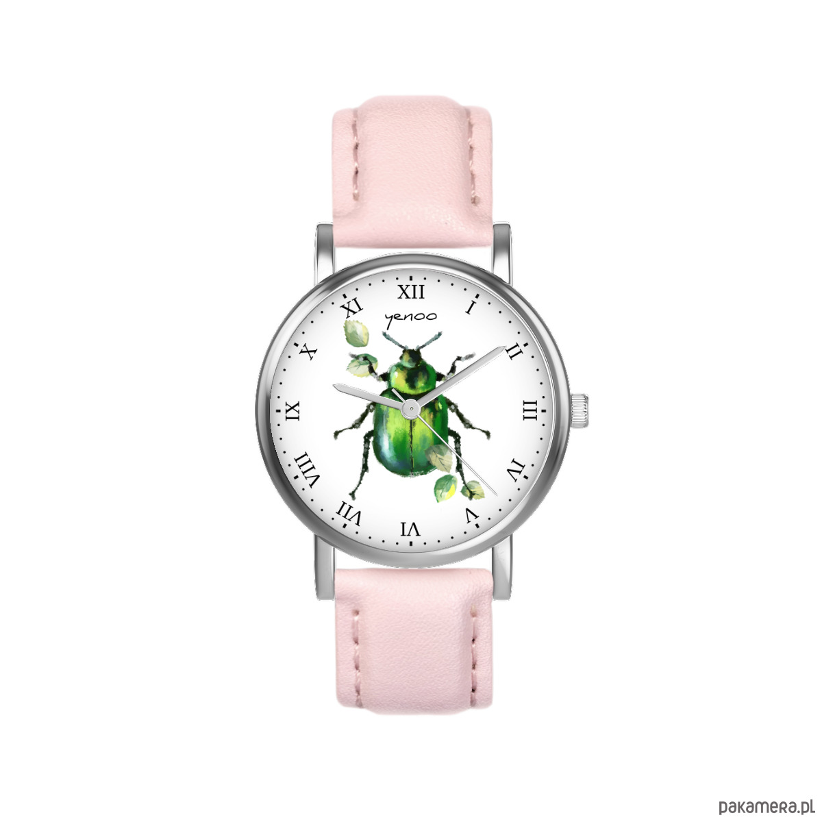 Zegarek mały - Zielony żuczek - skórzany, pudrowy róż