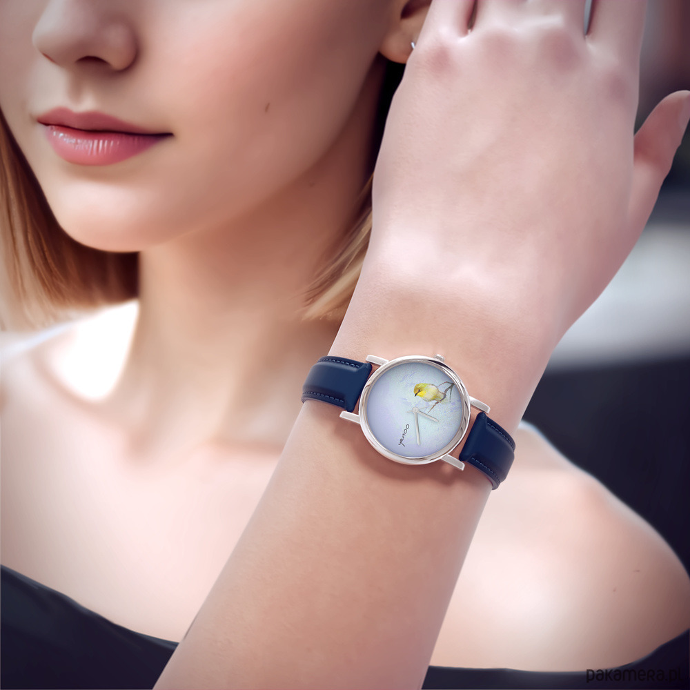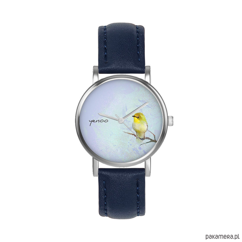 Zegarek mały - Żółty ptaszek - skórzany, granatowy