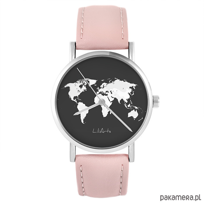 Zegarek - Mapa świata - skóra, pudrowy róż