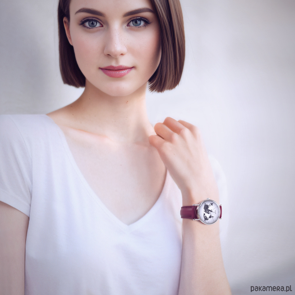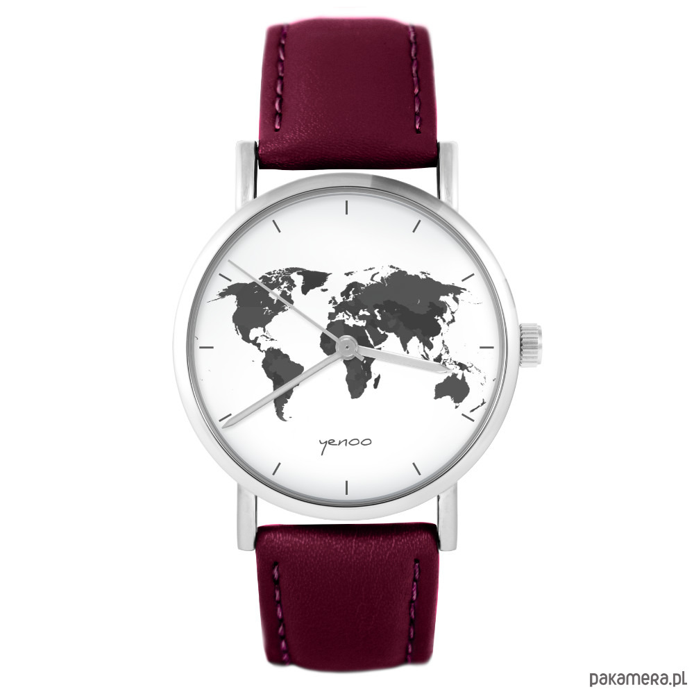 Zegarek - Mapa świata - skórzany, burgund