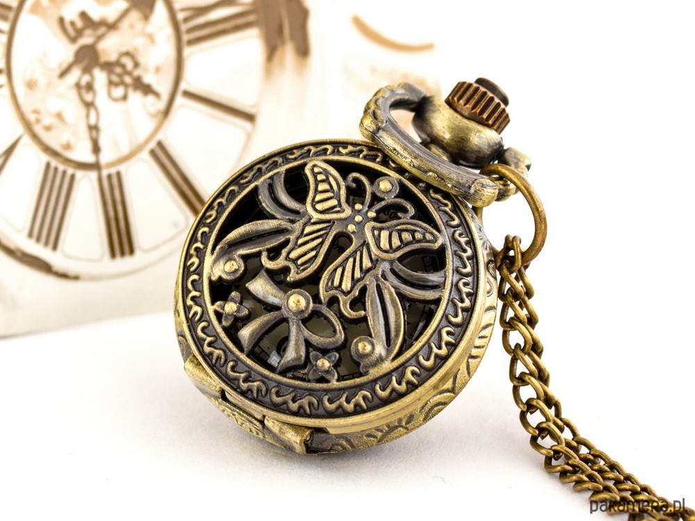 Maleńki zegarek o otwieranym sprężynowo-ażurowym wieczku z motywem motyla i kokardy dodającej minimalnej asymetrii do tego bardzo klasycznego wzoru. Pod wyobrażeniem pyszniącego się swą urodą motyla odnajdziecie Państwo schludnie wykonaną, wyrazistą tarczę koloru kremowego, na której wyraźnym kontrastem odcinają się arabskie cyfry i czarne wskazówki. Zegarek wykonany jest z brązu; wyposażony w odporne na zarysowania szkiełko i niezawodny, japoński mechanizm kwarcowy. Adresowany jest zdecydowanie do tych, które potrafią podkreślać swą kobiecość, zwłaszcza w jej tajemniczych i dynamicznych aspektach.