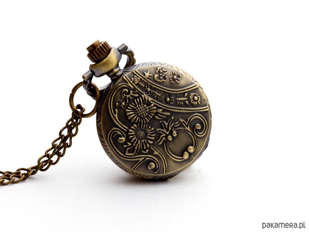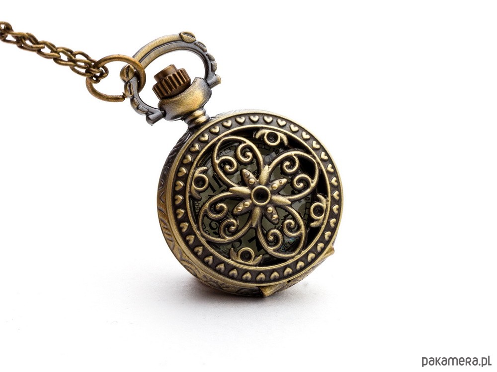 Urocza błyskotka o ażurowym wieczku ozdobionym symetrycznym motywem kwiatowym. Zegarek ma formę drobnego wisiora i pełni zarówno funkcję ozdobną, jak i użytkową – co gwarantuje czytelny cyferblat o pięknych cyfrach w klasycznym kroju. Mimo staroświeckiego wyglądu wewnątrz tej drobiny bije precyzyjny, kwarcowy mechanizm zgodny z wszelkimi standardami dzisiejszych czasomierzy. Przyciśnięcie przycisku ukrytego przy zamocowaniu łańcuszka uruchamia sprężynę otwierającą zegarek. Rzecz pogodna i delikatna – i właśnie takim osobom dedykowana.