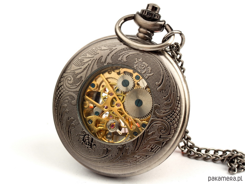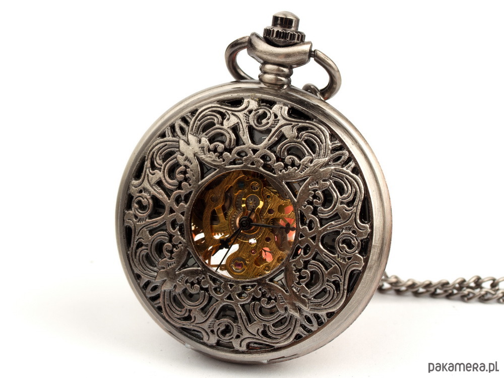 Przepiękny wisior charakteryzujące się ażurowym wykończeniem w kolorze starego srebra. Wzór ten poprzez swą delikatność stanowi przepiękną ozdobę każdej kreacji. Wisior po otwarciu przyciskiem znajdującym się tuż przy pierścieniu, ukazuje bardzo czytelną tarczę zegarka oraz część mechanizmu ukrytego w środku. Jako jeden z nielicznych zegarków w naszej kolekcji posiada arabskie cyfry na tarczy. Jasna, biała tarcza i czarne wskazówki świetnie kontrastują nadają charakteru zegarkowi. Tylna ścianka zegarka bogato zdobiona wzornictwem kwiatowym oraz przez szklaną szybkę można przeglądać duszę zegarka. Na zdjęciu zegarek zaprezentowano z łańcuszkiem kieszonkowym, dzięki niemu może pełnić wyjątkową ozdobę do kobiecych marynarek, czy spodni. Natomiast domyślnie w zestawie jest łańcuszek również w kolorystyce starego srebra, który umożliwia wygodne zawieszenie zegarka jako bardzo oryginalny wisior.